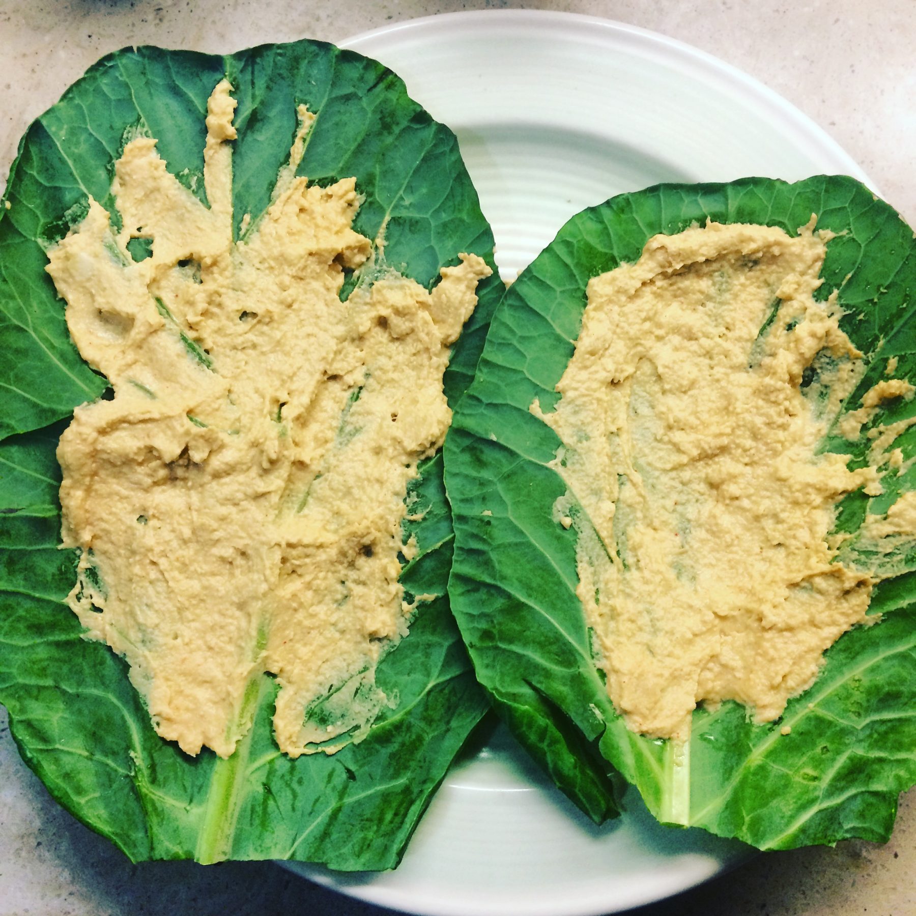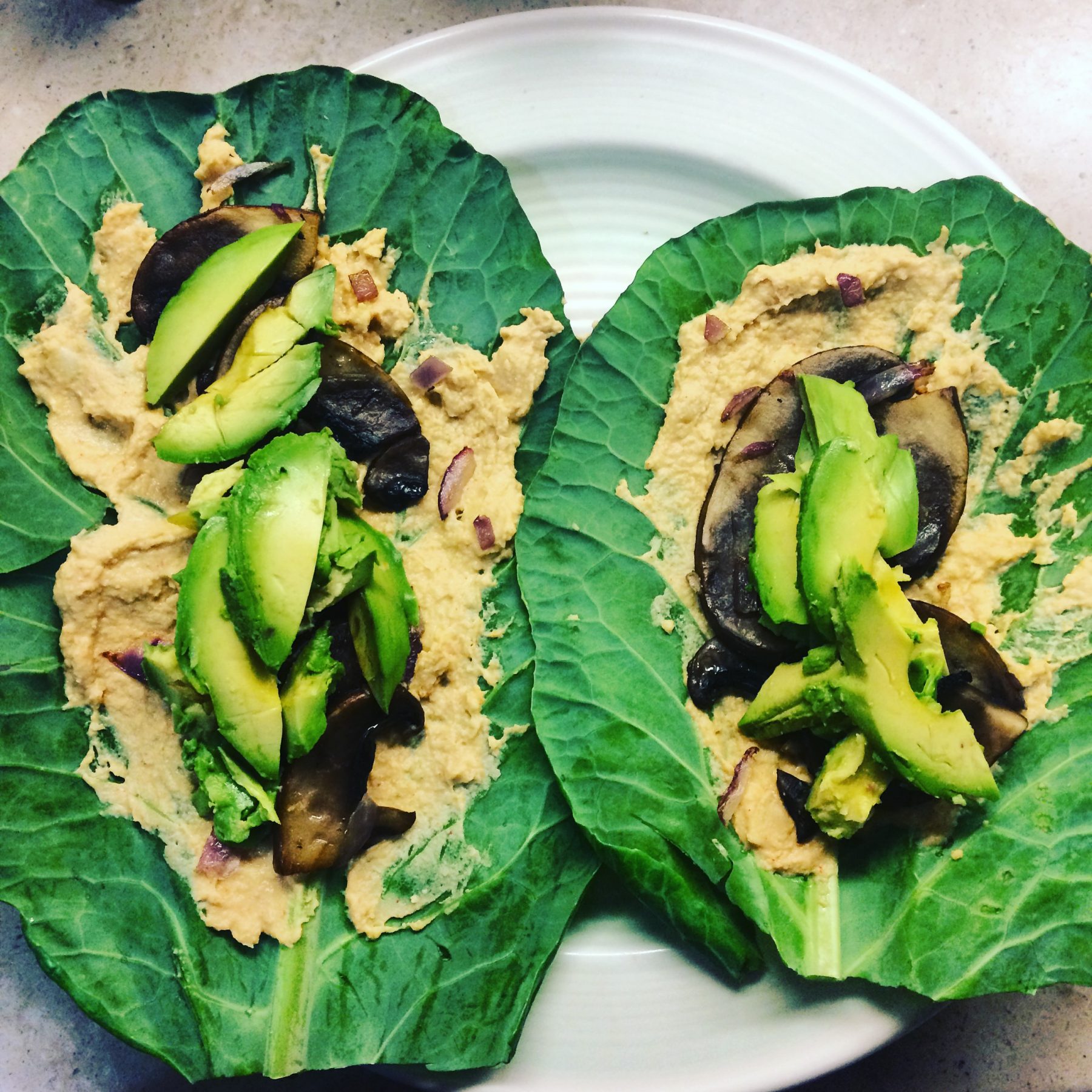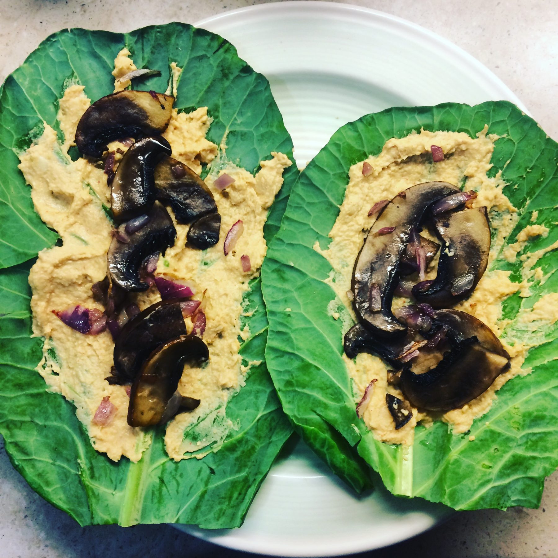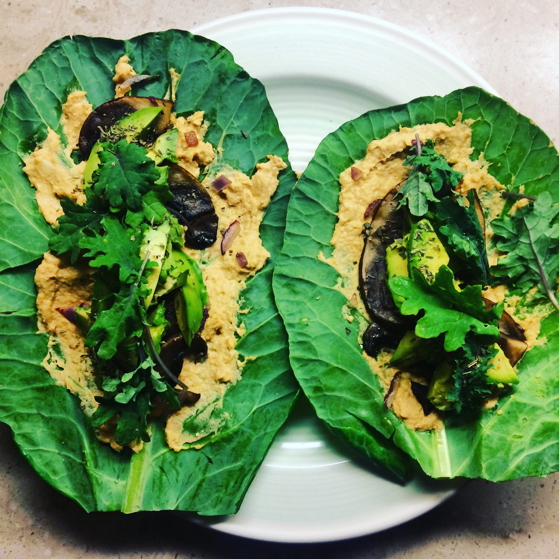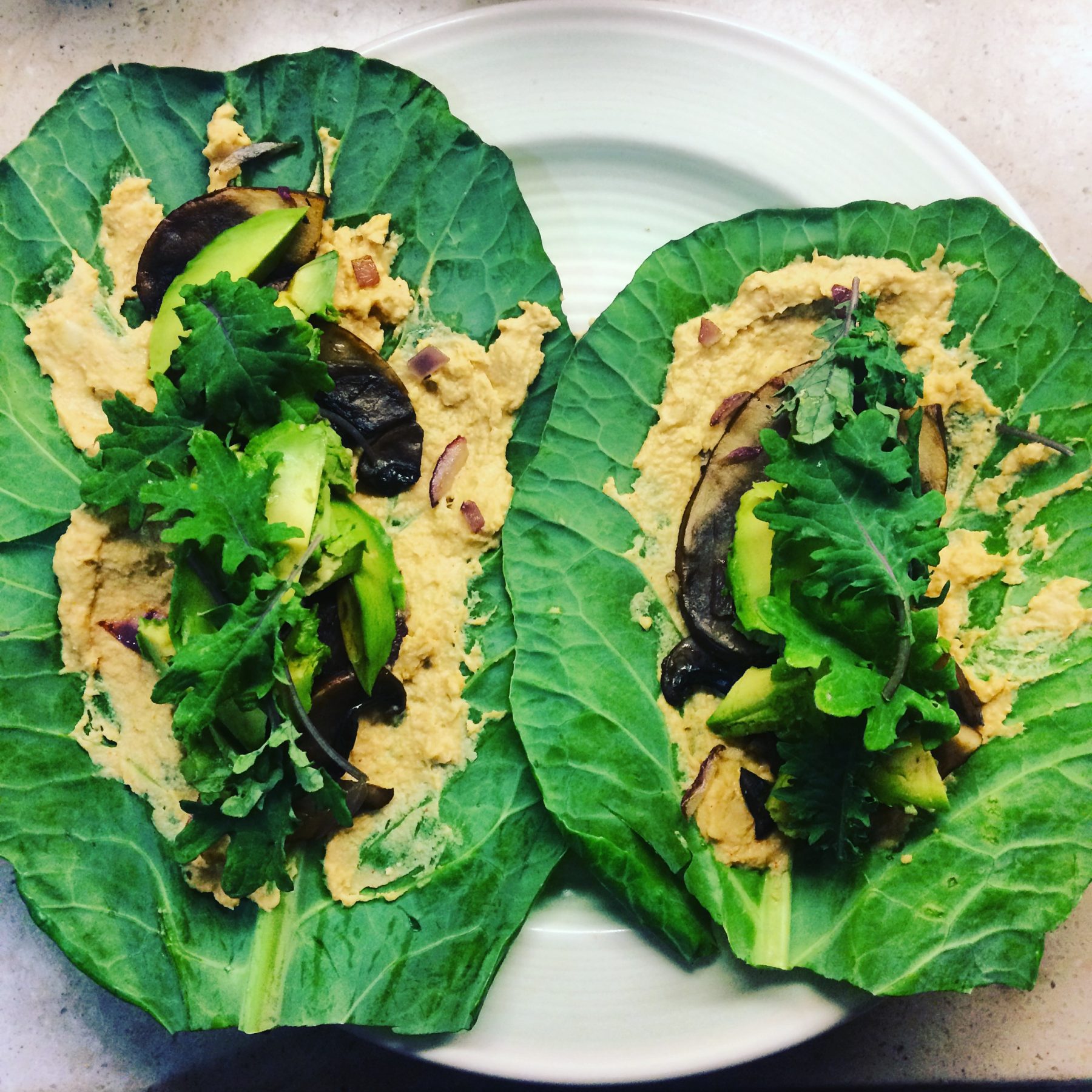 - Assemble your collard wrap by spreading a layer of hummus, then add your warm mushrooms, avocado, greens and herbs. You may also add other raw veggies like bell pepper, sprouts or tomato for more delicious combinations. Wrap like a burrito and enjoy!